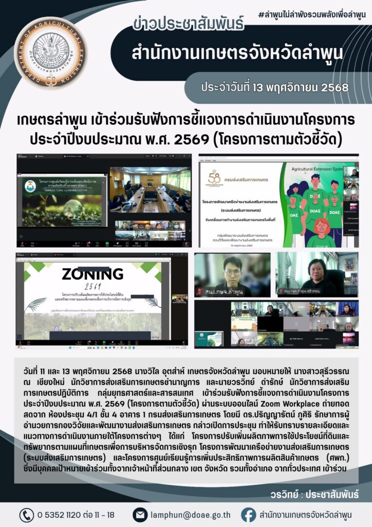 วันที่ 11 และ 13 พฤศจิกายน 2568 นางวิไล อุตส่าห์ เกษตรจังหวัดลำพูน มอบหมายให้ นางสาวสุธีวรรณ ณ เชียงใหม่ นักวิชาการส่งเสริมการเกษตรชำนาญการ และนายวรวิทย์ ดำรักษ์ นักวิชาการส่งเสริมการเกษตรปฏิบัติการ กลุ่มยุทธศาสตร์และสารสนเทศ เข้าร่วมรับฟังการชี้แจงการดำเนินงานโครงการประจำปีงบประมาณ พ.ศ. 2569 (โครงการตามตัวชี้วัด) ผ่านระบบออนไลน์ Zoom Workplace ถ่ายทอดสดจาก ห้องประชุม 4/1 ชั้น 4 อาคาร 1 กรมส่งเสริมการเกษตร โดยมี ดร.ปริญญารัตน์ ภูศิริ รักษาการผู้อำนวยการกองวิจัยและพัฒนางานส่งเสริมการเกษตร กล่าวเปิดการประชุม ทำให้รับทราบรายละเอียดและแนวทางการดำเนินงานภายใต้โครงการต่างๆ ได้แก่ โครงการปรับเพิ่มผลิตภาพการใช้ประโยชน์ที่ดินและทรัพยากรตามแผนที่เกษตรเพื่อการบริหารจัดการเชิงรุก โครงการพัฒนาเครือข่ายงานส่งเสริมการเกษตร (ระบบส่งเสริมการเกษตร) และโครงการศูนย์เรียนรู้การเพิ่มประสิทธิภาพการผลิตสินค้าเกษตร (ศพก.) ซึ่งมีบุคคลเป้าหมายเข้าร่วมทั้งจากเจ้าหน้าที่ส่วนกลาง เขต จังหวัด รวมทั้งอำเภอ จากทั่วประเทศ เข้าร่วม
