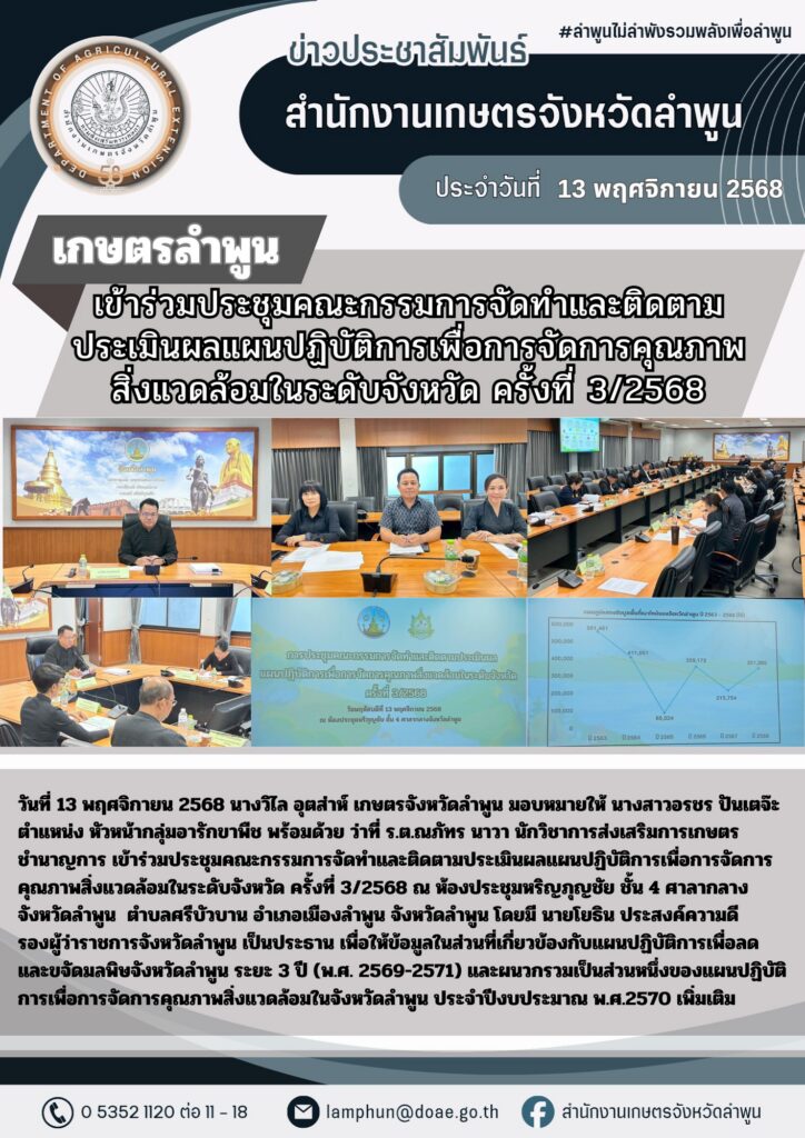 วันที่ 13 พฤศจิกายน 2568 นางวิไล อุตส่าห์ เกษตรจังหวัดลำพูน มอบหมายให้ นางสาวอรชร ปันเตจ๊ะ ตำแหน่ง หัวหน้ากลุ่มอารักขาพืช พร้อมด้วย ว่าที่ ร.ต.ณภัทร นาวา นักวิชาการส่งเสริมการเกษตรชำนาญการ เข้าร่วมประชุมคณะกรรมการจัดทำและติดตามประเมินผลแผนปฏิบัติการเพื่อการจัดการคุณภาพสิ่งแวดล้อมในระดับจังหวัด ครั้งที่ 3/2568 ณ ห้องประชุมหริญภุญชัย ชั้น 4 ศาลากลางจังหวัดลำพูน ตำบลศรีบัวบาน อำเภอเมืองลำพูน จังหวัดลำพูน โดยมี นายโยธิน ประสงค์ความดี รองผู้ว่าราชการจังหวัดลำพูน เป็นประธาน เพื่อให้ข้อมูลในส่วนที่เกี่ยวข้องกับแผนปฏิบัติการเพื่อลดและขจัดมลพิษจังหวัดลำพูน ระยะ 3 ปี (พ.ศ. 2569-2571) และผนวกรวมเป็นส่วนหนึ่งของแผนปฏิบัติการเพื่อการจัดการคุณภาพสิ่งแวดล้อมในจังหวัดลำพูน ประจำปีงบประมาณ พ.ศ.2570 เพิ่มเติม