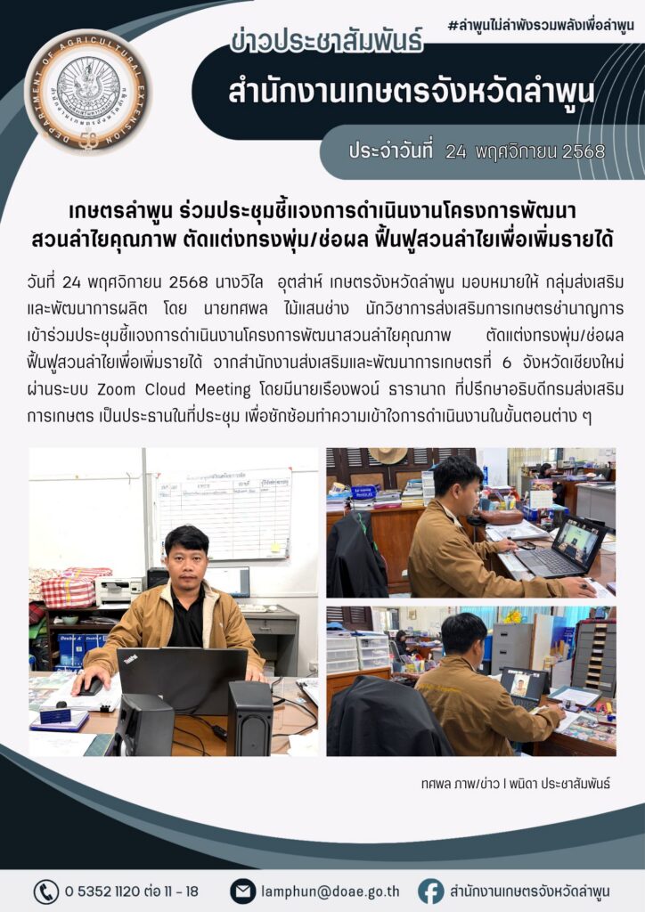 เกษตรลำพูน ร่วมประชุมชี้แจงการดำเนินงานโครงการพัฒนาสวนลำไยคุณภาพ ตัดแต่งทรงพุ่ม/ช่อผล ฟื้นฟูสวนลำไยเพื่อเพิ่มรายได้