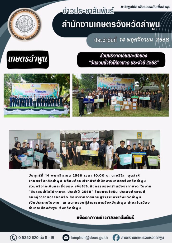 วันศุกร์ที่ 14 พฤศจิกายน 2568 เวลา 10.00 น. นางวิไล อุตส่าห์ เกษตรจังหวัดลำพูน พร้อมด้วยเจ้าหน้าที่สำนักงานเกษตรจังหวัดลำพูน ร่วมบริจาคเงินและสิ่งของ เพื่อใช้ในกิจกรรมออกร้านมัจฉากาชาด ในงาน “วันรวมน้ำใจให้กาชาด ประจำปี 2568” โดยนายโยธิน ประสงค์ความดี รองผู้ว่าราชการจังหวัด รักษาราชการแทนผู้ว่าราชการจังหวัดลำพูน เป็นประธานในงาน ณ สนามจวนผู้ว่าราชการจังหวัดลำพูน ตำบลในเมือง อำเภอเมืองลำพูน จังหวัดลำพูน