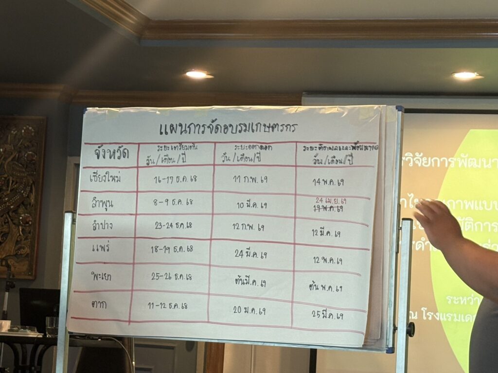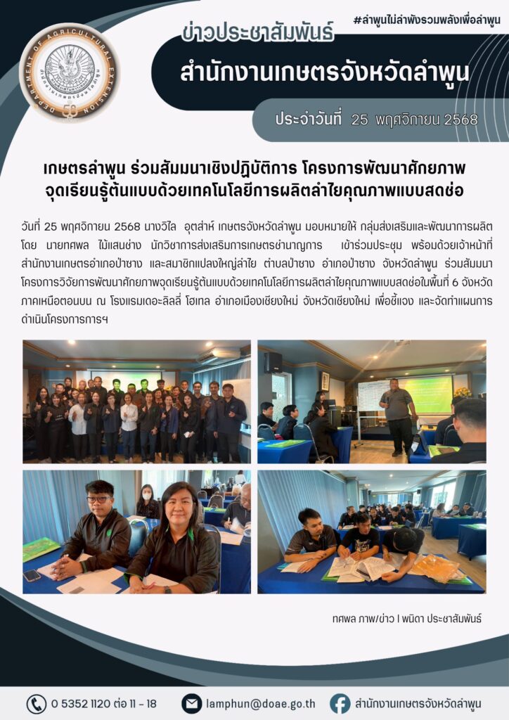 วันที่ 25 พฤศจิกายน 2568 นางวิไล อุตส่าห์ เกษตรจังหวัดลำพูน มอบหมายให้ กลุ่มส่งเสริมและพัฒนาการผลิต โดย นายทศพล ไม้แสนช่าง นักวิชาการส่งเสริมการเกษตรชำนาญการ เข้าร่วมประชุม พร้อมด้วยเจ้าหน้าที่สำนักงานเกษตรอำเภอป่าซาง และสมาชิกแปลงใหญ่ลำไย ตำบลป่าซาง อำเภอป่าซาง จังหวัดลำพูน ร่วมสัมมนาโครงการวิจัยการพัฒนาศักยภาพจุดเรียนรู้ต้นแบบด้วยเทคโนโลยีการผลิตลำไยคุณภาพแบบสดช่อในพื้นที่ 6 จังหวัดภาคเหนือตอนบน ณ โรงแรมเดอะลิลลี่ โฮเทล อำเภอเมืองเชียงใหม่ จังหวัดเชียงใหม่ เพื่อชี้แจง และจัดทำแผนการดำเนินโครงการการฯ