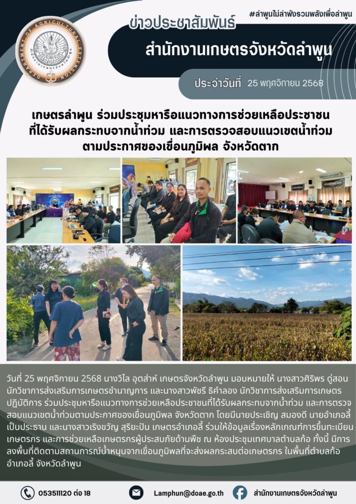 เกษตรลำพูน ร่วมประชุมหารือแนวทางการช่วยเหลือประชาชนที่ได้รับผลกระทบจากน้ำท่วม และการตรวจสอบแนวเขตน้ำท่วมตามประกาศของเขื่อนภูมิพล จังหวัดตากBy admin_doae / 1 ธันวาคม 2025 .