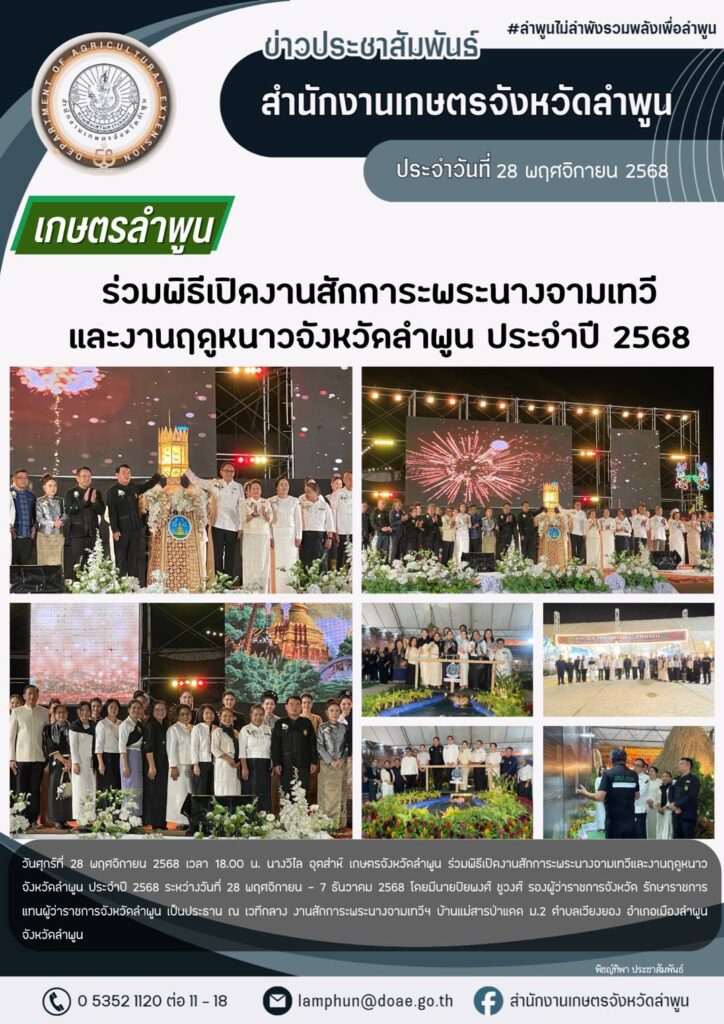 เกษตรลำพูน ร่วมพิธีเปิดงานสักการะพระนางจามเทวีและงานฤดูหนาวจังหวัดลำพูน ประจำปี 2568By admin_doae / 1 ธันวาคม 2025