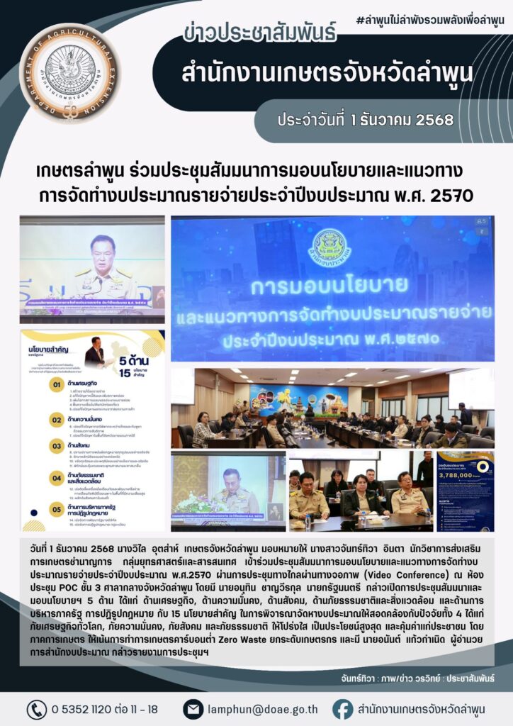 วันที่ 1 ธันวาคม 2568 นางวิไล อุตส่าห์ เกษตรจังหวัดลำพูน มอบหมายให้ นางสาวจันทร์ทิวา อินตา นักวิชาการส่งเสริมการเกษตรชำนาญการ กลุ่มยุทธศาสตร์และสารสนเทศ เข้าร่วมประชุมสัมมนาการมอบนโยบายและแนวทางการจัดทำงบประมาณรายจ่ายประจำปีงบประมาณ พ.ศ.2570 ผ่านการประชุมทางไกลผ่านทางจอภาพ (Video Conference) ณ ห้องประชุม POC ชั้น 3 ศาลากลางจังหวัดลำพูน โดยมี นายอนุทิน ชาญวีรกุล นายกรัฐมนตรี กล่าวเปิดการประชุมสัมมนาและมอบนโยบายฯ 5 ด้าน ได้แก่ ด้านเศรษฐกิจ, ด้านความมั่นคง, ด้านสังคม, ด้านภัยธรรมชาติและสิ่งแวดล้อม และด้านการบริหารภาครัฐ การปฏิรูปกฎหมาย กับ 15 นโยบายสำคัญ ในการพิจารณาจัดหางบประมาณให้สอดคล้องกับปัจจัยทั้ง 4 ได้แก่ ภัยเศรษฐกิจทั่วโลก, ภัยความมั่นคง, ภัยสังคม และภัยธรรมชาติ ให้โปร่งใส เป็นประโยชน์สูงสุด และคุ้มค่าแก่ประชาชน โดยภาคการเกษตร ให้เน้นการทำการเกษตรคาร์บอนต่ำ Zero Waste ยกระดับเกษตรกร และมี นายอนันต์ แก้วกำเนิด ผู้อำนวยการสำนักงบประมาณ กล่าวรายงานการประชุมฯ