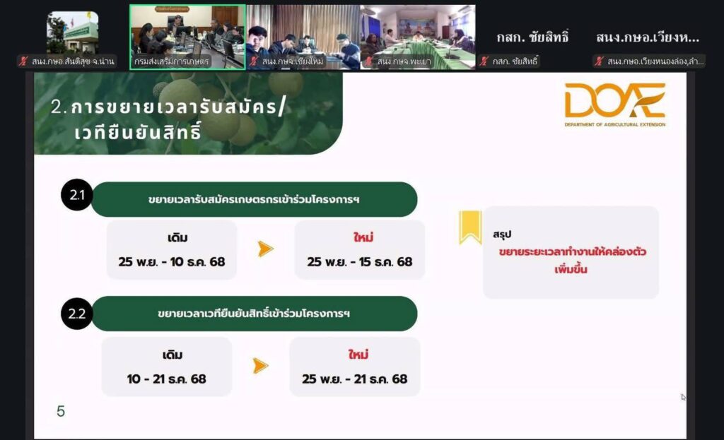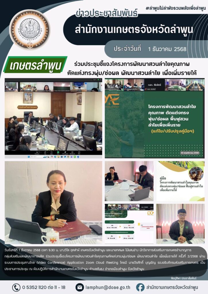 วันจันทร์ที่ 1 ธันวาคม 2568 เวลา 9.30 น. นางวิไล อุตส่าห์ เกษตรจังหวัดลำพูน และนายทศพล ไม้แสนช่าง นักวิชาการส่งเสริมการเกษตรชำนาญการ กลุ่มส่งเสริมและพัฒนาการผลิต ร่วมประชุมชี้แจงโครงการพัฒนาสวนลำไยคุณภาพตัดแต่งทรงพุ่ม/ช่อผล พัฒนาสวนลำไย เพื่อเพิ่มรายได้ ครั้งที่ 2/2568 ผ่านระบบการประชุมทางไกล (Video Conference) Application Zoom Cloud Meeting โดยมี นายวีรศักดิ์ บุญเชิญ รองอธิบดีกรมส่งเสริมการเกษตร เป็นประธานการประชุม ณ ห้องปฏิบัติการสำนักงานเกษตรจังหวัดลำพูน ตำบลต้นธง อำเภอเมืองลำพูน จังหวัดลำพูน