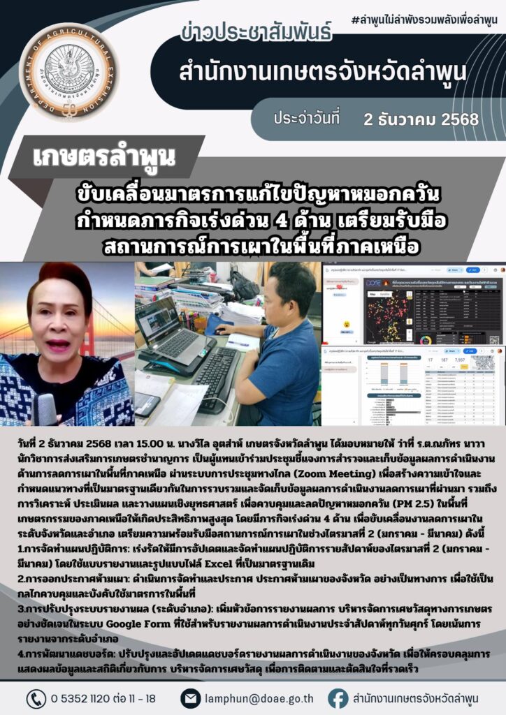 วันที่ 2 ธันวาคม 2568 เวลา 15.00 น. นางวิไล อุตส่าห์ เกษตรจังหวัดลำพูน ได้มอบหมายให้ ว่าที่ ร.ต.ณภัทร นาวา นักวิชาการส่งเสริมการเกษตรชำนาญการ เป็นผู้แทนเข้าร่วมประชุมชี้แจงการสำรวจและเก็บข้อมูลผลการดำเนินงานด้านการลดการเผาในพื้นที่ภาคเหนือ ผ่านระบบการประชุมทางไกล (Zoom Meeting) เพื่อสร้างความเข้าใจและกำหนดแนวทางที่เป็นมาตรฐานเดียวกันในการรวบรวมและจัดเก็บข้อมูลผลการดำเนินงานลดการเผาที่ผ่านมา รวมถึงการวิเคราะห์ ประเมินผล และวางแผนเชิงยุทธศาสตร์ เพื่อควบคุมและลดปัญหาหมอกควัน (PM 2.5) ในพื้นที่เกษตรกรรมของภาคเหนือให้เกิดประสิทธิภาพสูงสุด โดยมีภารกิจเร่งด่วน 4 ด้าน เพื่อขับเคลื่อนงานลดการเผาในระดับจังหวัดและอำเภอ เตรียมความพร้อมรับมือสถานการณ์การเผาในช่วงไตรมาสที่ 2 (มกราคม – มีนาคม) ดังนี้