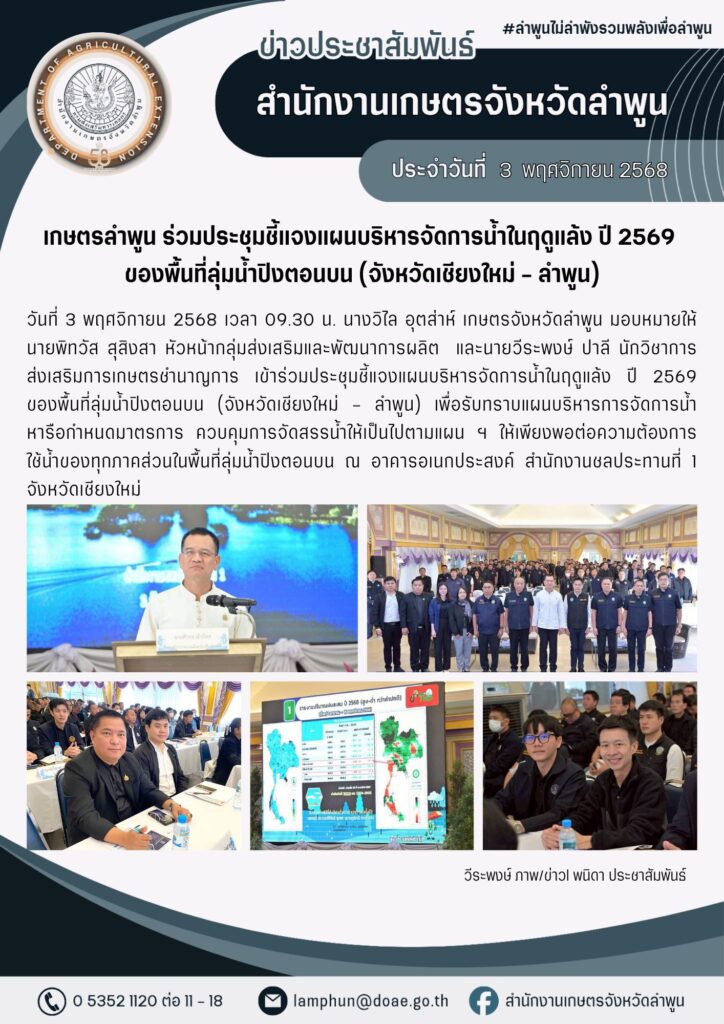 วันที่ 3 ธันวาคม 2568 เวลา 09.30 น. นางวิไล อุตส่าห์ เกษตรจังหวัดลำพูน มอบหมายให้นายพิทวัส สุสิงสา หัวหน้ากลุ่มส่งเสริมและพัฒนาการผลิต และนายวีระพงษ์ ปาลี นักวิชาการส่งเสริมการเกษตรชำนาญการ เข้าร่วมประชุมชี้แจงแผนบริหารจัดการน้ำในฤดูแล้ง ปี 2569 ของพื้นที่ลุ่มน้ำปิงตอนบน (จังหวัดเชียงใหม่ – ลำพูน) เพื่อรับทราบแผนบริหารการจัดการน้ำ หารือกำหนดมาตรการ ควบคุมการจัดสรรน้ำให้เป็นไปตามแผน ฯ ให้เพียงพอต่อความต้องการใช้น้ำของทุกภาคส่วนในพื้นที่ลุ่มน้ำปิงตอนบน ณ อาคารอเนกประสงค์ สำนักงานชลประทานที่ 1 จังหวัดเชียงใหม่