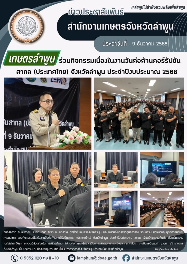 เกษตรลำพูนร่วมกิจกรรมเนื่่องในงานวันต่อต้านคอร์รัปชันสากล (ประเทศไทย) จังหวัดลำพูน ประจำปีงบประมาณ 2568By admin_doae / 9 ธันวาคม 2025