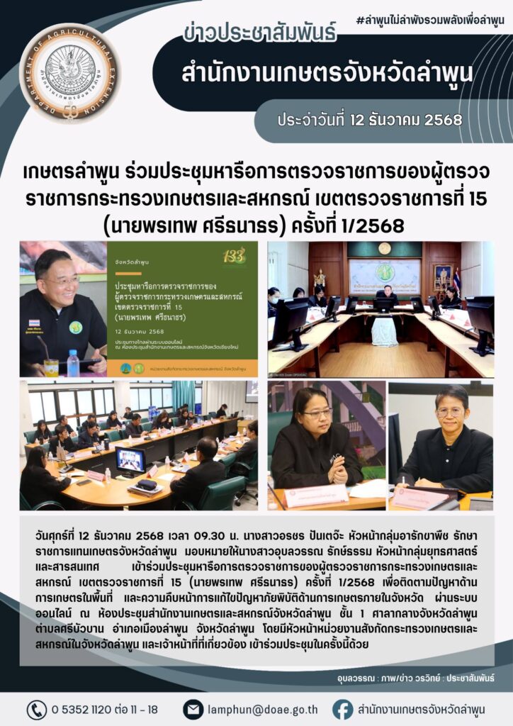 เกษตรลำพูน ร่วมประชุมหารือการตรวจราชการ ของผู้ตรวจราชการกระทรวงเกษตรและสหกรณ์ เขตตรวจราชการที่ 15 (นายพรเทพ ศรีธนาธร) ครั้งที่ 1/2568By admin_doae / 15 ธันวาคม 2025