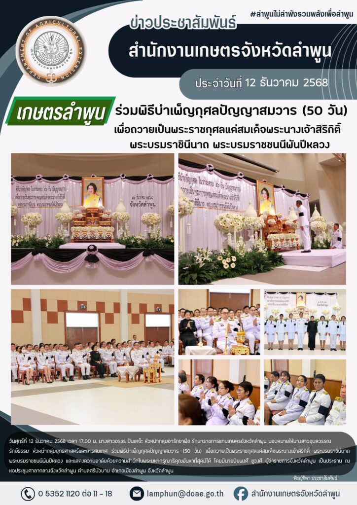 เกษตรลำพูนร่วมพิธีบำเพ็ญกุศลปัญญาสมวาร (50 วัน) เพื่อถวายเป็นพระราชกุศลแด่สมเด็จพระนางเจ้าสิริกิติ์ พระบรมราชินีนาถ พระบรมราชชนนีพันปีหลวงBy admin_doae / 15 ธันวาคม 2025