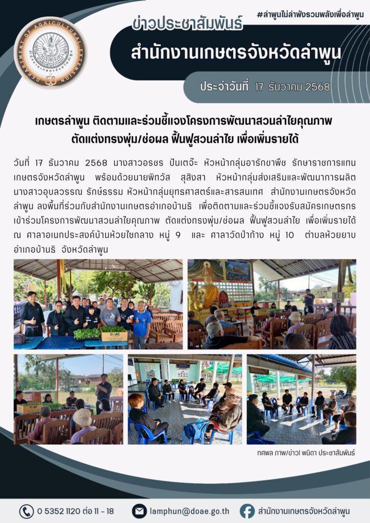 วันที่ 17 ธันวาคม 2568 นางสาวอรชร ปันเตจ๊ะ หัวหน้ากลุ่มอารักขาพืช รักษาราชการแทนเกษตรจังหวัดลำพูน พร้อมด้วยนายพิทวัส สุสิงสา หัวหน้ากลุ่มส่งเสริมและพัฒนาการผลิต นางสาวอุบลวรรณ รักษ์ธรรม หัวหน้ากลุ่มยุทธศาสตร์และสารสนเทศ สำนักงานเกษตรจังหวัดลำพูน ลงพื้นที่ร่วมกับสำนักงานเกษตรอำเภอบ้านธิ เพื่อติดตามและร่วมชี้แจงรับสมัครเกษตรกรเข้าร่วมโครงการพัฒนาสวนลำไยคุณภาพ ตัดแต่งทรงพุ่ม/ช่อผล ฟื้นฟูสวนลำไย เพื่อเพิ่มรายได้ ณ ศาลาอเนกประสงค์บ้านห้วยไซกลาง หมู่ 9 และ ศาลาวัดป่าก้าง หมู่ 10 ตำบลห้วยยาบ อำเภอบ้านธิ จังหวัดลำพูน