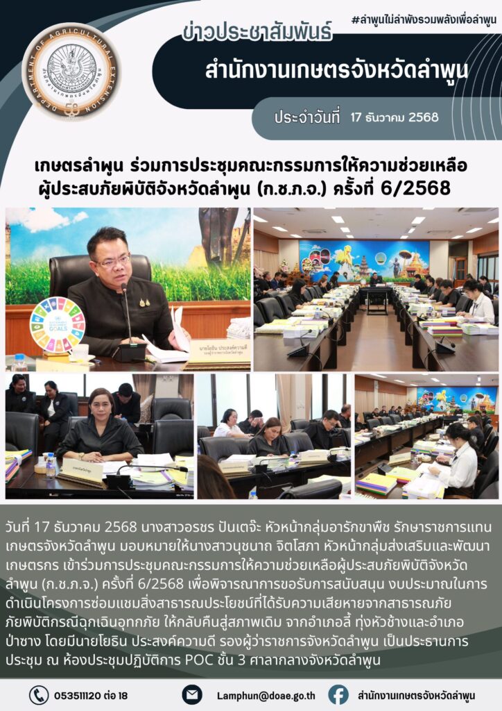เกษตรลำพูน ร่วมการประชุมคณะกรรมการให้ความช่วยเหลือผู้ประสบภัยพิบัติจังหวัดลำพูน (ก.ช.ภ.จ.) ครั้งที่ 6/2568By admin_doae / 18 ธันวาคม 2025