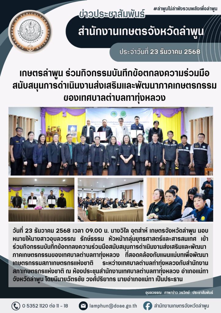 เกษตรลำพูน ร่วมกิจกรรมบันทึกข้อตกลงความร่วมมือสนับสนุนการดำเนินงานส่งเสริมและพัฒนาภาคเกษตรกรรมของเทศบาลตำบลทาทุ่งหลวงBy admin_doae / 23 ธันวาคม 2025