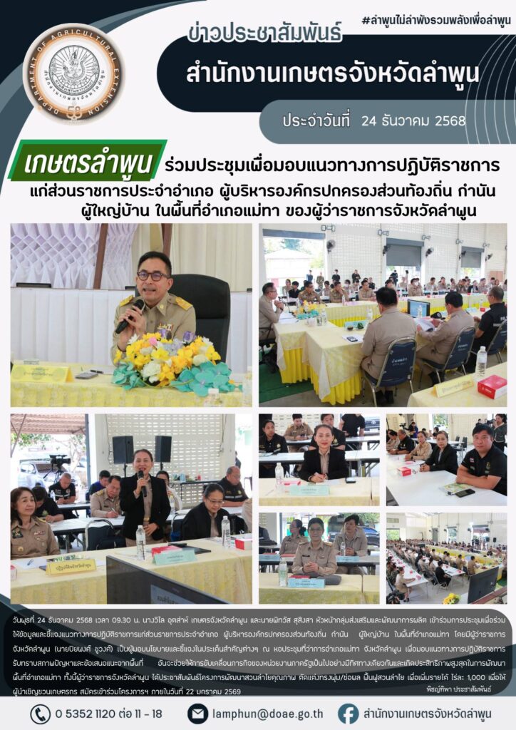 เกษตรลำพูน เข้าร่วมการประชุมเพื่อมอบแนวทางการปฏิบัติราชการแก่ส่วนราชการประจำอำเภอ ผู้บริหารองค์กรปกครองส่วนท้องถิ่น กำนัน ผู้ใหญ่บ้าน ในพื้นที่อำเภอแม่ทา ของผู้ว่าราชการจังหวัดลำพูนBy admin_doae / 25 ธันวาคม 2025