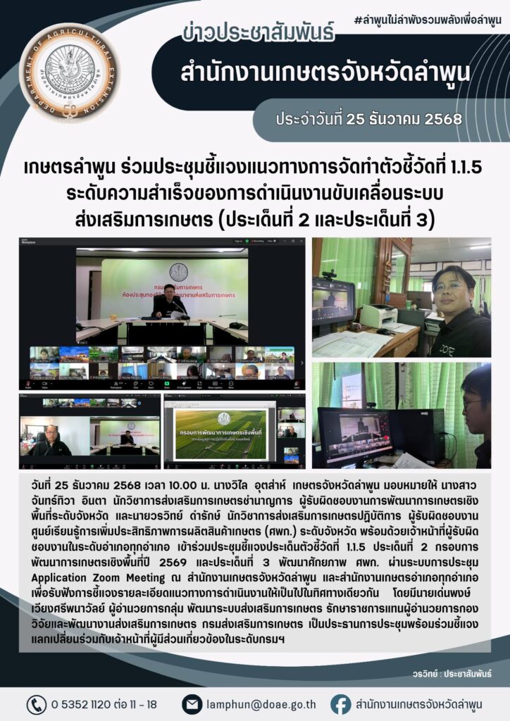 เกษตรลำพูน ร่วมประชุมชี้แจงแนวทางการจัดทำตัวชี้วัดที่ 1.1.5 ระดับความสำเร็จของการดำเนินงานขับเคลื่อนระบบส่งเสริมการเกษตร (ประเด็นที่ 2 และประเด็นที่ 3)By admin_doae / 26 ธันวาคม 2025