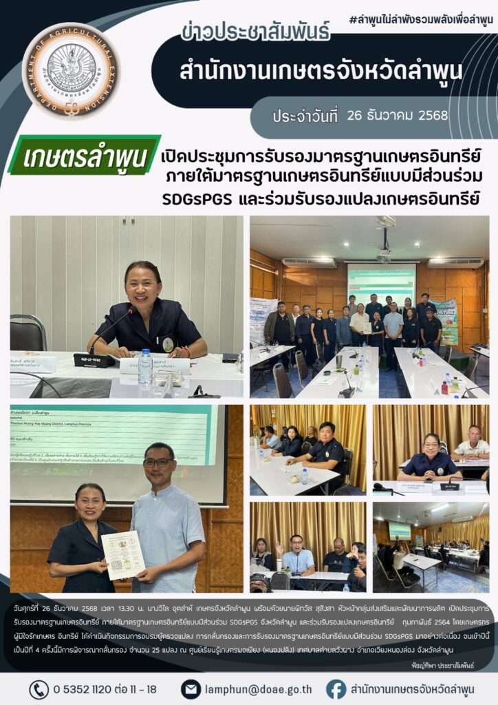 เกษตรลำพูน เปิดประชุมการรับรองมาตรฐานเกษตรอินทรีย์ ภายใต้มาตรฐานเกษตรอินทรีย์แบบมีส่วนร่วม SDGsPGS จังหวัดลำพูน และร่วมรับรองแปลงเกษตรอินทรีย์By admin_doae / 30 ธันวาคม 2025