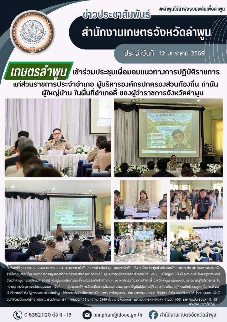 เกษตรลำพูน เข้าร่วมการประชุมเพื่อร่วมให้ข้อมูลและชี้แจงแนวทางการปฏิบัติราชการแก่ส่วนราชการประจำอำเภอ ผู้บริหารองค์กรปกครองส่วนท้องถิ่น กำนัน ผู้ใหญ่บ้าน ในพื้นที่อำเภอลี้By admin_doae / 12 มกราคม 2026