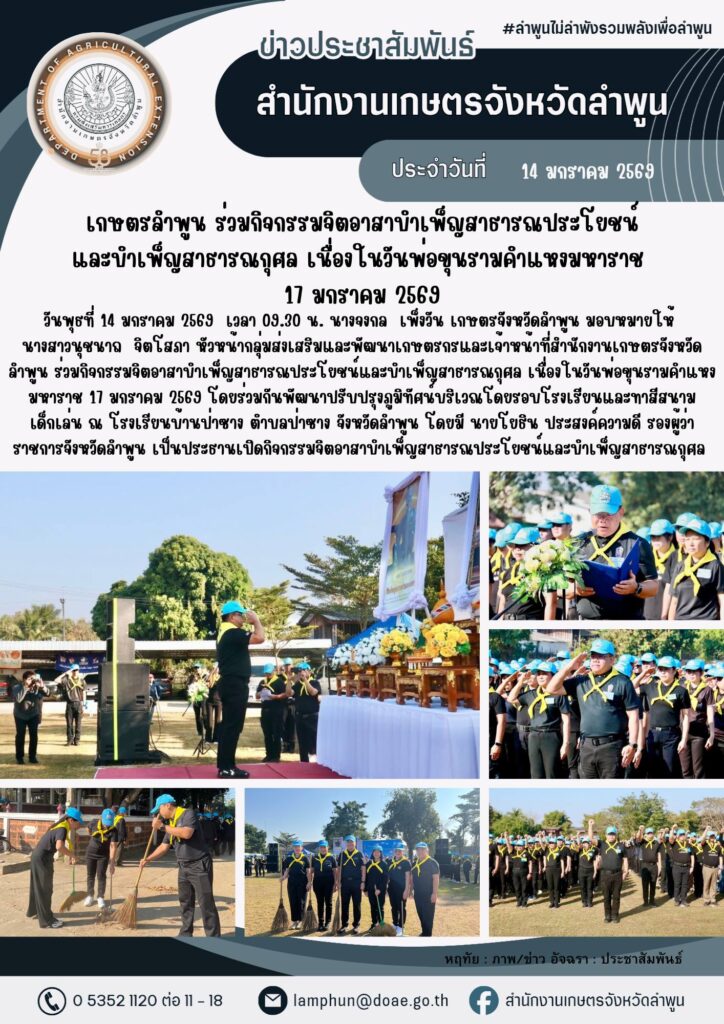 เกษตรลำพูน ร่วมกิจกรรมจิตอาสาบำเพ็ญสาธารณประโยชน์และบำเพ็ญสาธารณกุศล เนื่องในวันพ่อขุนรามคำแหงมหาราช 17 มกราคม 2569By admin_doae / 15 มกราคม 2026