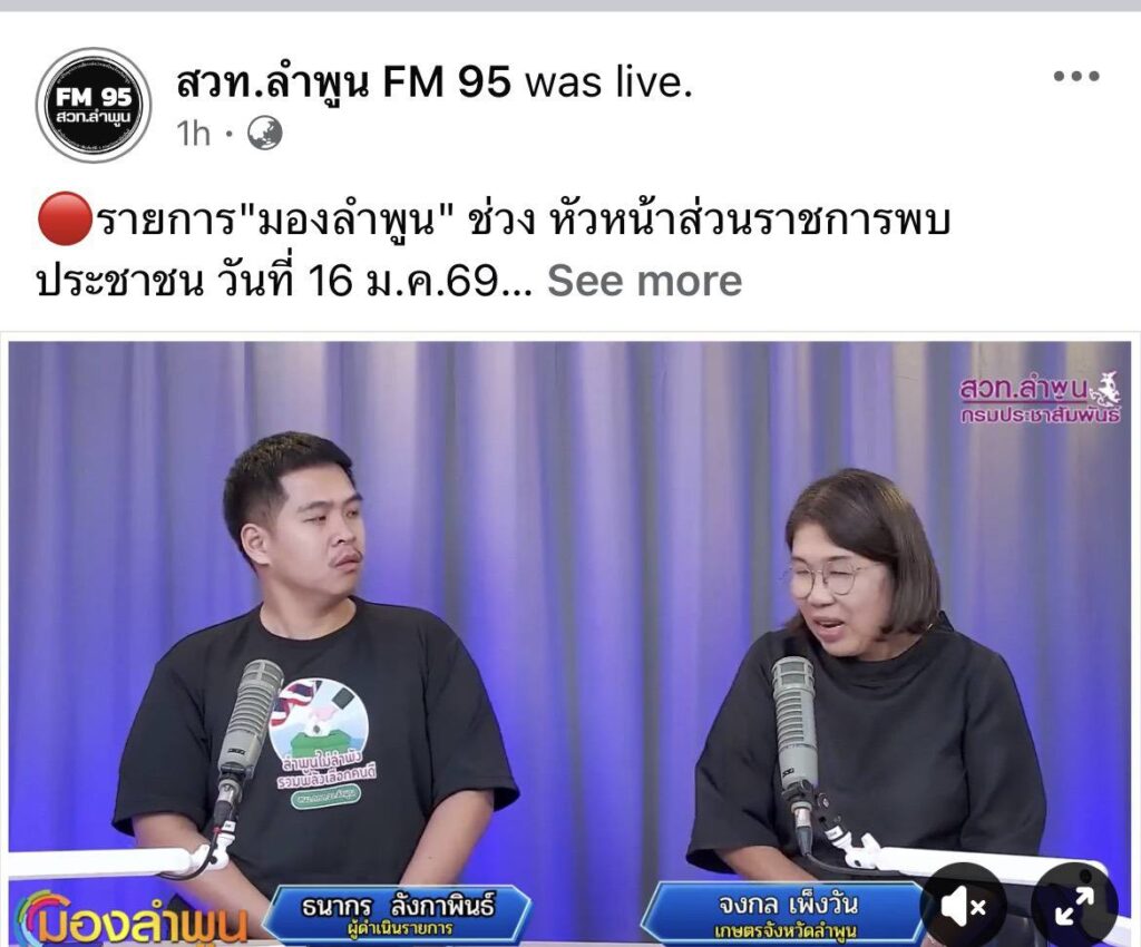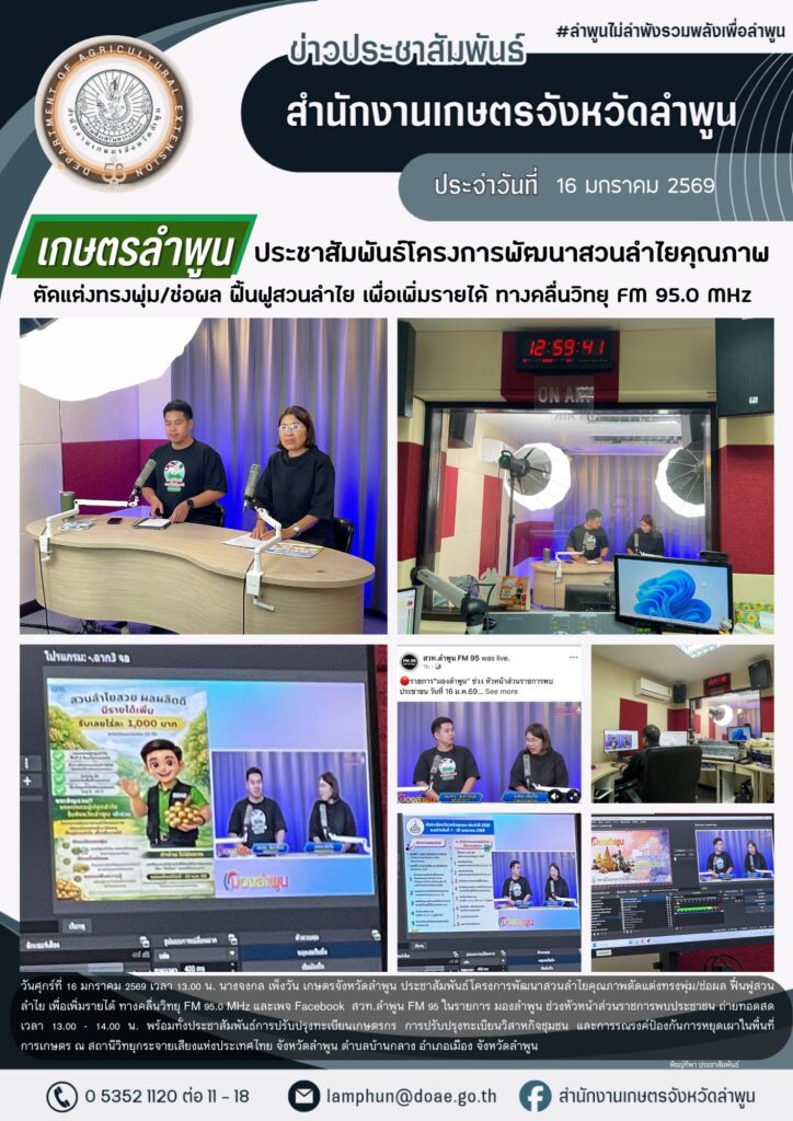 เกษตรลำพูน ประชาสัมพันธ์โครงการพัฒนาสวนลำไยคุณภาพตัดแต่งทรงพุ่ม/ช่อผล ฟื้นฟูสวนลำไย เพื่อเพิ่มรายได้ ทางคลื่นวิทยุ FM 95.0 MHzBy admin_doae / 16 มกราคม 2026