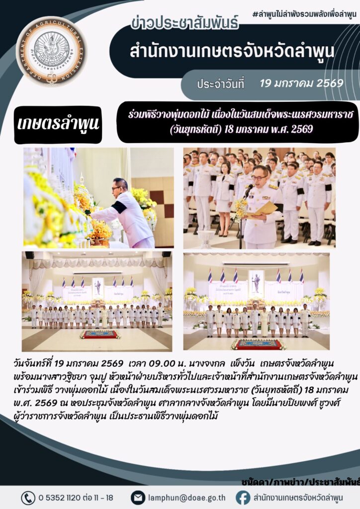 เกษตรลำพูน..ร่วมพิธีวางพุ่มดอกไม้ เนื่องในวันสมเด็จพระนเรศวรมหาราช (วันยุทธหัตถี) 18 มกราคม พ.ศ. 2569By admin_doae / 19 มกราคม 2026