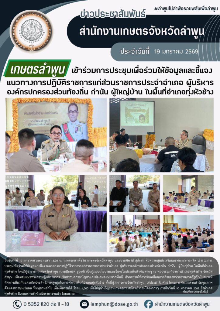 เกษตรลำพูนเข้าร่วมการประชุมเพื่อร่วมให้ข้อมูลและชี้แจงแนวทางการปฏิบัติราชการแก่ส่วนราชการประจำอำเภอ ผู้บริหารองค์กรปกครองส่วนท้องถิ่น กำนัน ผู้ใหญ่บ้าน ในพื้นที่อำเภอทุ่งหัวช้างBy admin_doae / 20 มกราคม 2026