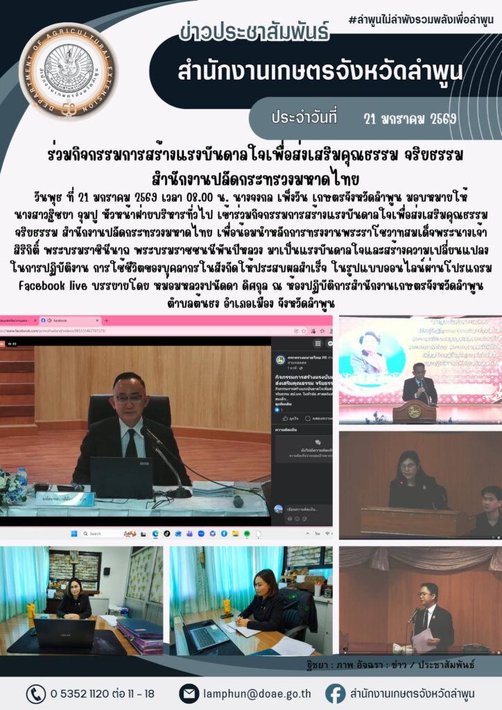 เกษตรลำพูน ร่วมกิจกรรมการสร้างแรงบันดาลใจเพื่อส่งเสริมคุณธรรม จริยธรรม สำนักงานปลัดกระทรวงมหาดไทยBy admin_doae / 22 มกราคม 2026