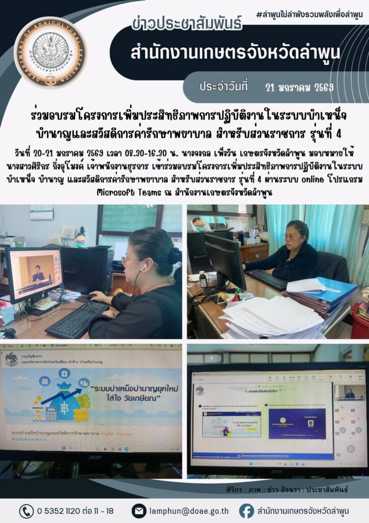 เกษตรลำพูน ร่วมอบรมโครงการเพิ่มประสิทธิภาพการปฏิบัติงานในระบบบำเหน็จบำนาญและสวัสดิการค่ารักษาพยาบาล สำหรับส่วนราชการ รุ่นที่ 4By admin_doae / 22 มกราคม 2026