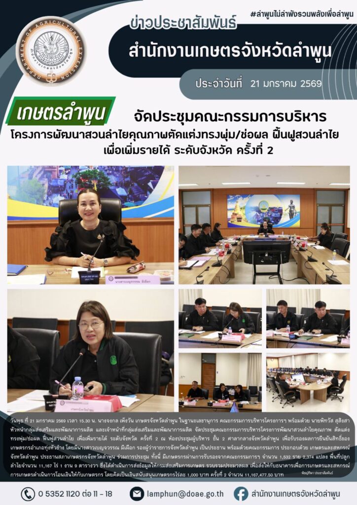 เกษตรลำพูน จัดประชุมคณะกรรมการบริหารโครงการพัฒนาสวนลำไยคุณภาพ ตัดแต่งทรงพุ่ม/ช่อผล ฟื้นฟูสวนลำไย เพื่อเพิ่มรายได้ ระดับจังหวัด ครั้งที่ 2By admin_doae / 22 มกราคม 2026