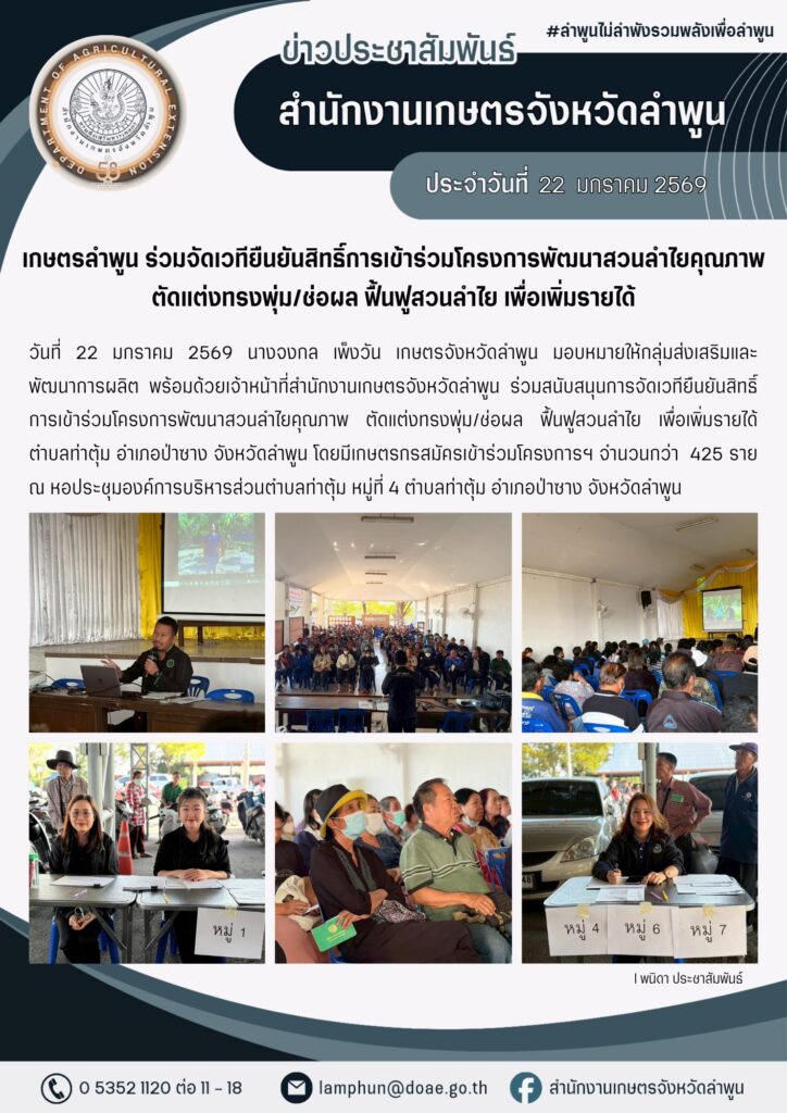 เกษตรลำพูน ร่วมจัดเวทียืนยันสิทธิ์การเข้าร่วมโครงการพัฒนาสวนลำไยคุณภาพ ตัดแต่งทรงพุ่ม/ช่อผล ฟื้นฟูสวนลำไย เพื่อเพิ่มรายได้By admin_doae / 23 มกราคม 2026