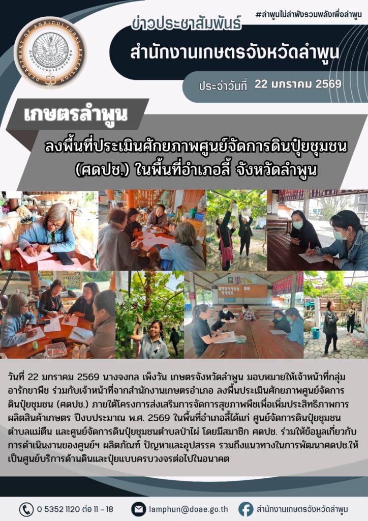 เกษตรลำพูน ลงพื้นที่ประเมินศักยภาพศูนย์จัดการดินปุ๋ยชุมชน (ศดปช.) ในพื้นที่อำเภอลี้ จังหวัดลำพูนBy admin_doae / 23 มกราคม 2026
