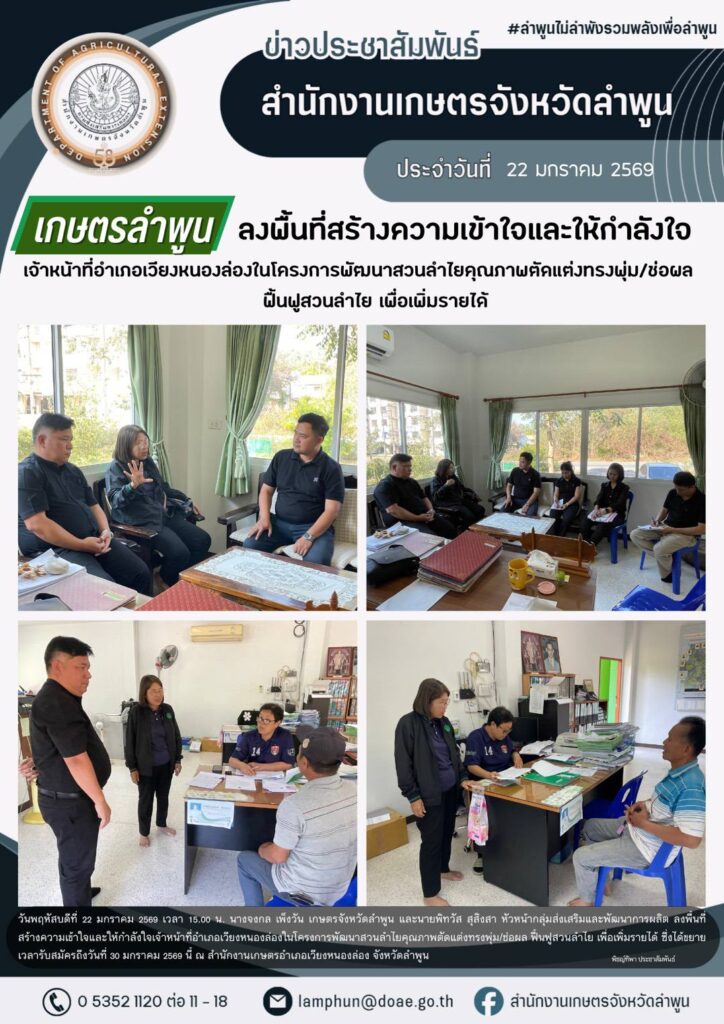 เกษตรลำพูนลงพื้นที่สร้างความเข้าใจและให้กำลังใจเจ้าหน้าที่อำเภอเวียงหนองล่องในโครงการพัฒนาสวนลำไยคุณภาพตัดแต่งทรงพุ่ม/ช่อผล ฟื้นฟูสวนลำไย เพื่อเพิ่มรายได้By admin_doae / 23 มกราคม 2026
