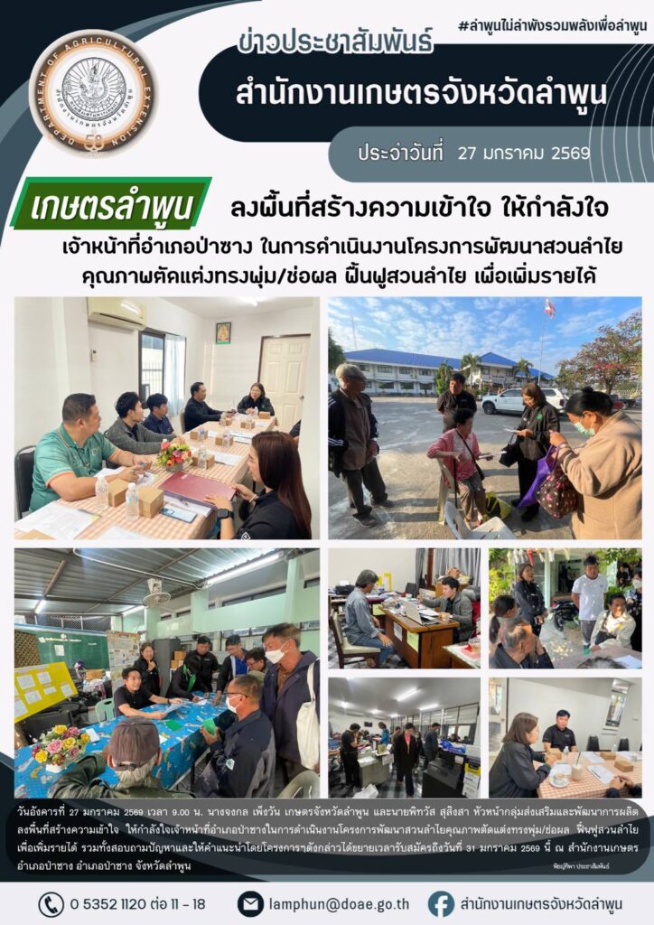 เกษตรลำพูนลงพื้นที่สร้างความเข้าใจ ให้กำลังใจเจ้าหน้าที่อำเภอป่าซางในการดำเนินงานโครงการพัฒนาสวนลำไยคุณภาพตัดแต่งทรงพุ่ม/ช่อผล ฟื้นฟูสวนลำไย เพื่อเพิ่มรายได้By admin_doae / 27 มกราคม 2026