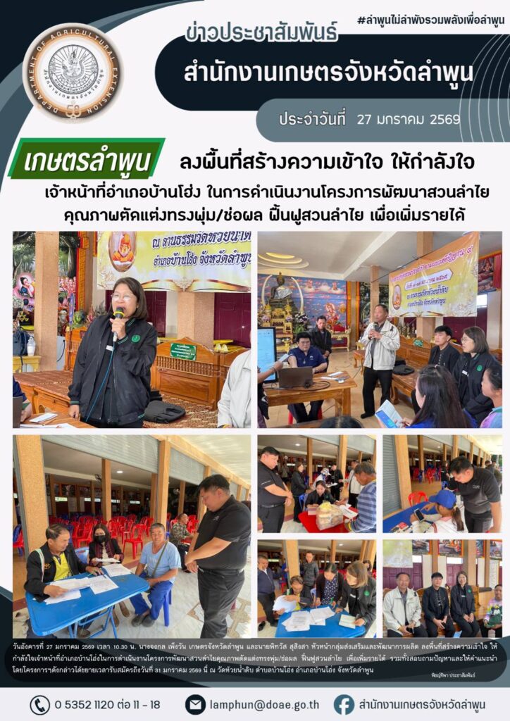 เกษตรลำพูนลงพื้นที่สร้างความเข้าใจ ให้กำลังใจเจ้าหน้าที่อำเภอบ้านโฮ่งในการดำเนินงานโครงการพัฒนาสวนลำไยคุณภาพตัดแต่งทรงพุ่ม/ช่อผล ฟื้นฟูสวนลำไย เพื่อเพิ่มรายได้By admin_doae / 27 มกราคม 2026