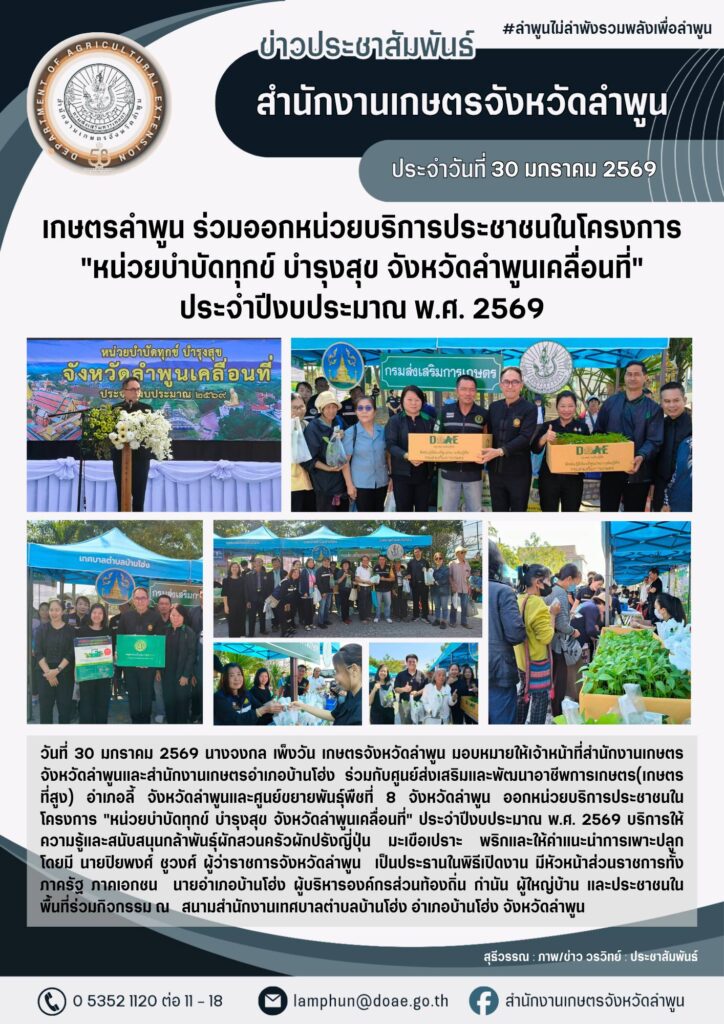 เกษตรลำพูน ร่วมออกหน่วยบริการประชาชนในโครงการ “หน่วยบำบัดทุกข์ บำรุงสุข จังหวัดลำพูนเคลื่อนที่” ประจำปีงบประมาณ พ.ศ. 2569By admin_doae / 30 มกราคม 2026