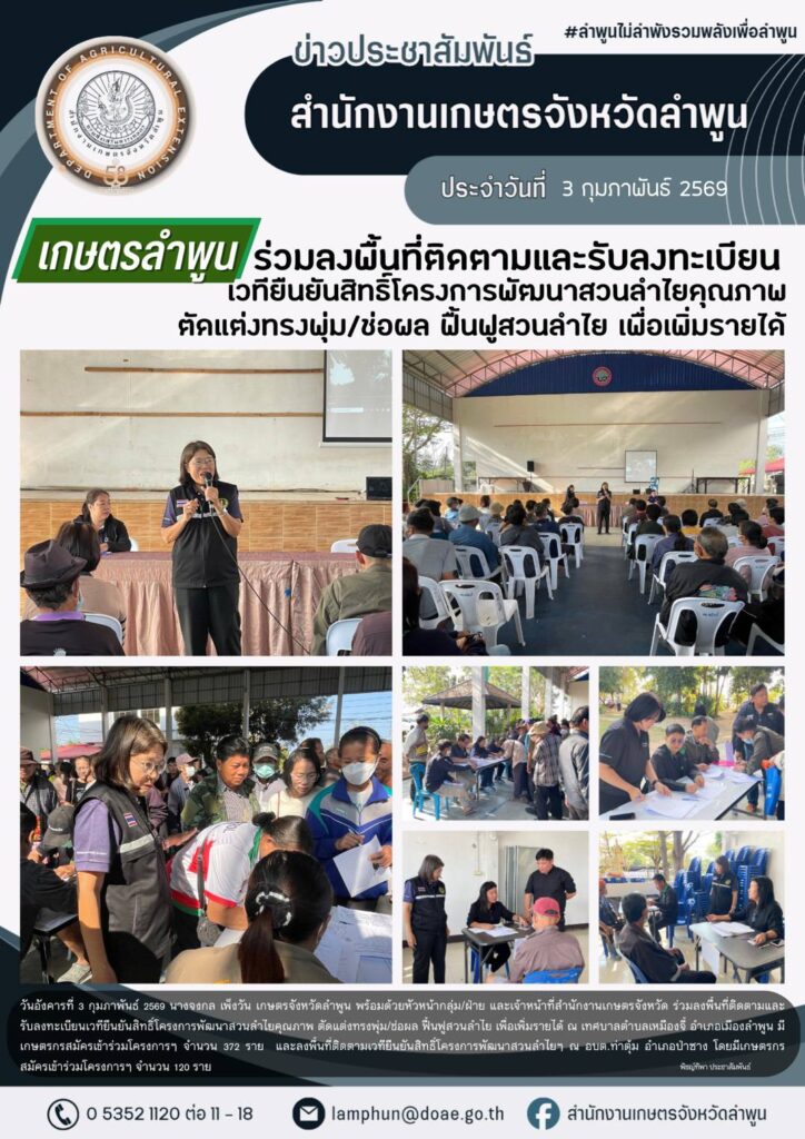 เกษตรลำพูน ร่วมลงพื้นที่ติดตามและรับลงทะเบียนเวทียืนยันสิทธิ์โครงการพัฒนาสวนลำไยคุณภาพ ตัดแต่งทรงพุ่ม/ช่อผล ฟื้นฟูสวนลำไย เพื่อเพิ่มรายได้By admin_doae / 4 กุมภาพันธ์ 2026