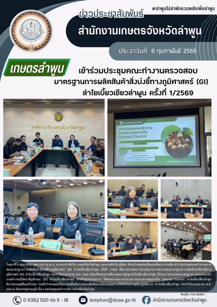 เกษตรลำพูนเข้าร่วมประชุมคณะทำงานตรวจสอบมาตรฐานการผลิตสินค้าสิ่งบ่งชี้ทางภูมิศาสตร์ (GI) ลำไยเบี้ยวเขียวลำพูน ครั้งที่ 1/2569By admin_doae / 9 กุมภาพันธ์ 2026