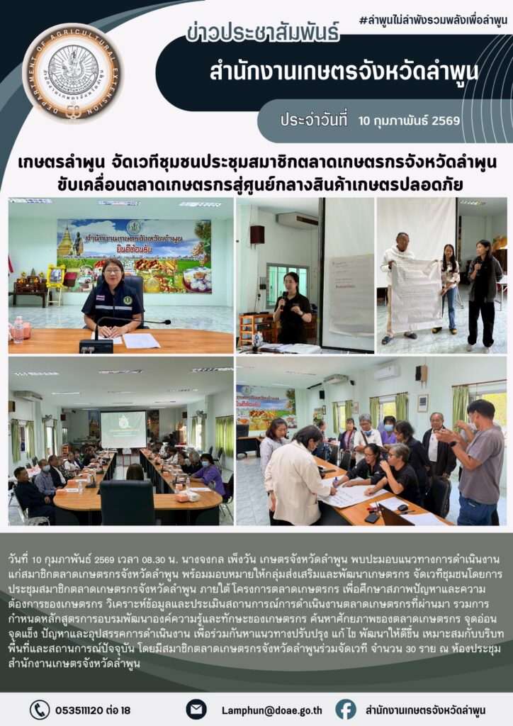 เกษตรลำพูน จัดเวทีชุมชนประชุมสมาชิกตลาดเกษตรกรจังหวัดลำพูน ขับเคลื่อนตลาดเกษตรกรสู่ศูนย์กลางสินค้าเกษตรปลอดภัยBy admin_doae / 11 กุมภาพันธ์ 2026