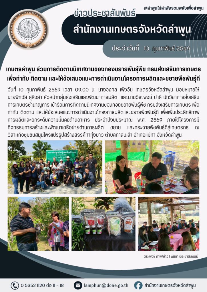 เกษตรลำพูน ร่วมการติดตามนิเทศงานของกองขยายพันธุ์พืช กรมส่งเสริมการเกษตร เพื่อกำกับ ติดตาม และให้ข้อเสนอแนะการดำเนินงานโครงการผลิตและขยายพืชพันธุ์ดีBy admin_doae / 11 กุมภาพันธ์ 2026
