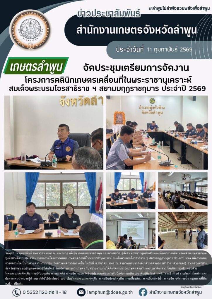 เกษตรลำพูนจัดประชุมเตรียมการจัดงานโครงการคลินิกเกษตรเคลื่อนที่ในพระราชานุเคราะห์ สมเด็จพระบรมโอรสาธิราช ฯ สยามมกุฎราชกุมาร ประจำปี 256By admin_doae / 12 กุมภาพันธ์ 2026