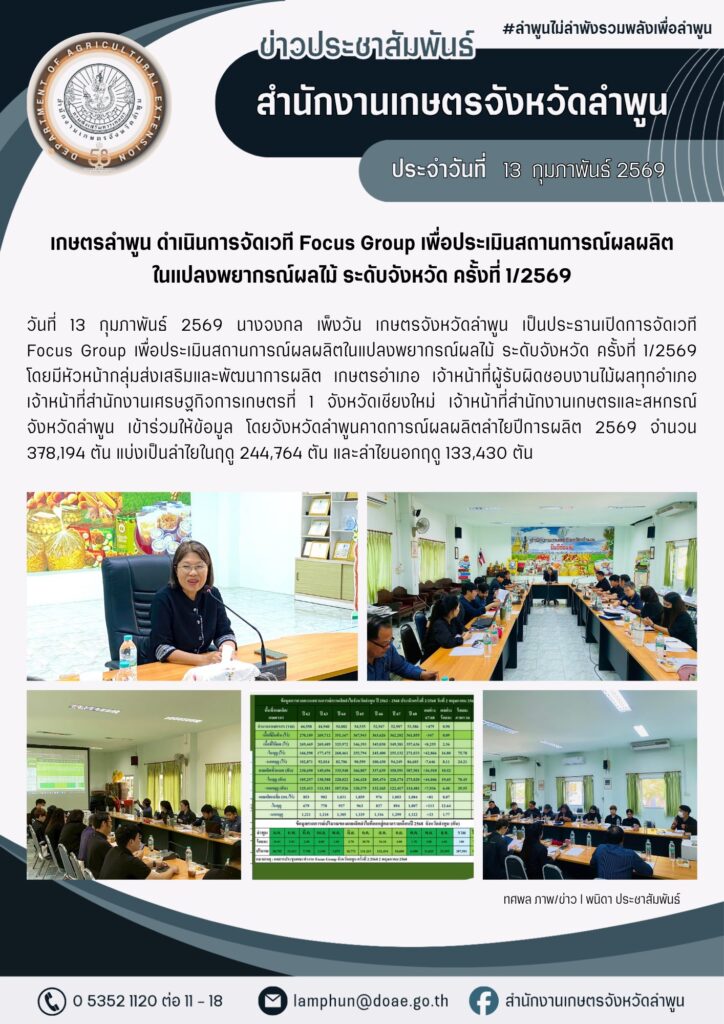 เกษตรลำพูน ดำเนินการจัดเวที Focus Group เพื่อประเมินสถานการณ์ผลผลิตในแปลงพยากรณ์ผลไม้ ระดับจังหวัด ครั้งที่ 1/2569By admin_doae / 16 กุมภาพันธ์ 2026