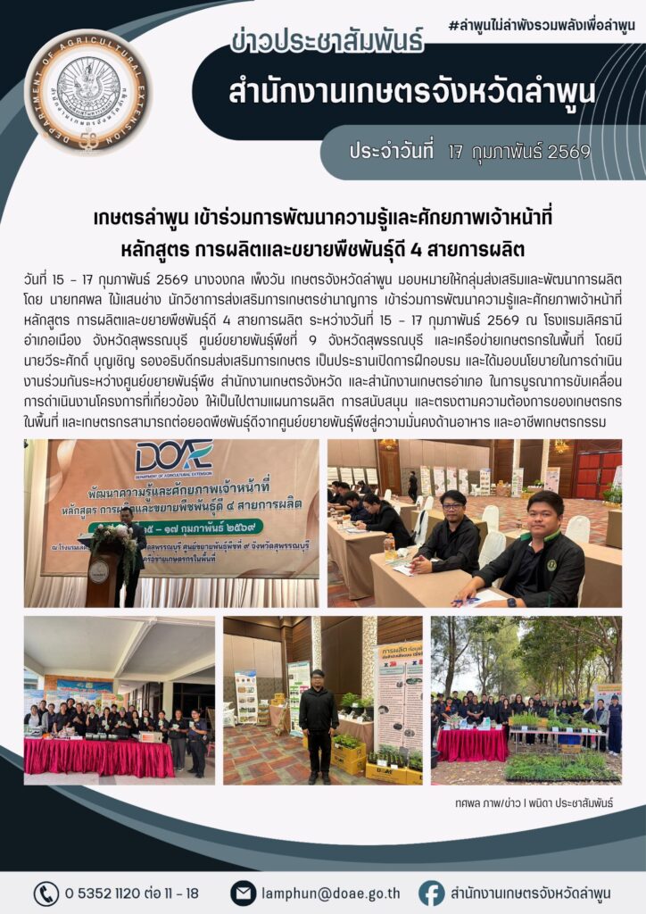 เกษตรลำพูน เข้าร่วมการพัฒนาความรู้และศักยภาพเจ้าหน้าที่ หลักสูตร การผลิตและขยายพืชพันธุ์ดี 4 สายการผลิตBy admin_doae / 19 กุมภาพันธ์ 2026