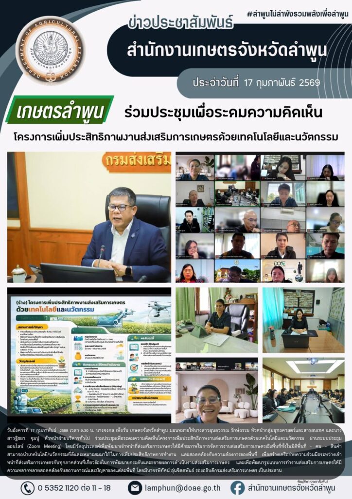 เกษตรลำพูนร่วมประชุมเพื่อระดมความคิดเห็นโครงการเพิ่มประสิทธิภาพงานส่งเสริมการเกษตรด้วยเทคโนโลยีและนวัตกรรมBy admin_doae / 19 กุมภาพันธ์ 2026