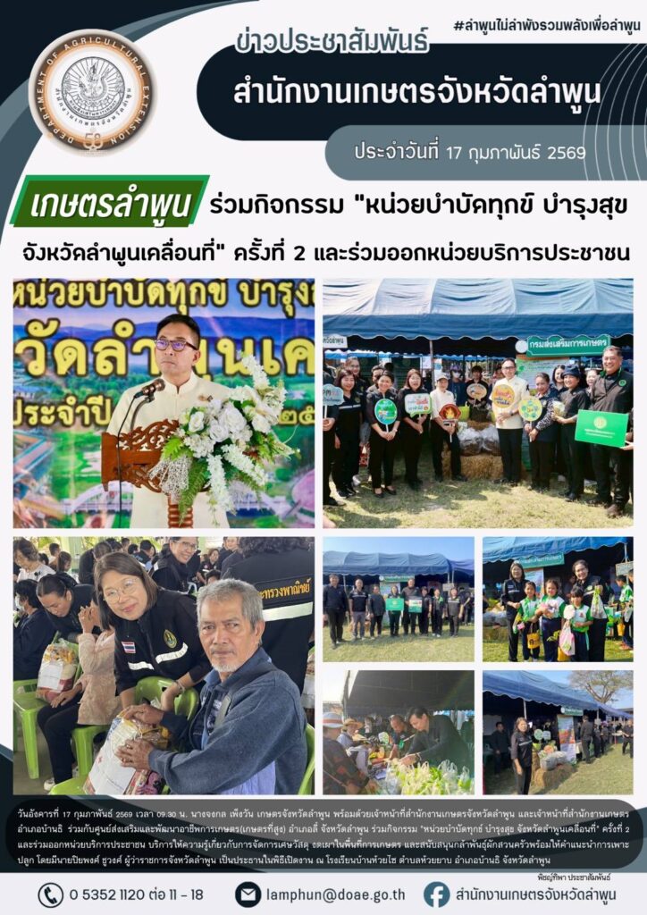 เกษตรลำพูนร่วมกิจกรรม “หน่วยบำบัดทุกข์ บำรุงสุข จังหวัดลำพูนเคลื่อนที่” ครั้งที่ 2 และร่วมออกหน่วยบริการประชาชนBy admin_doae / 19 กุมภาพันธ์ 2026