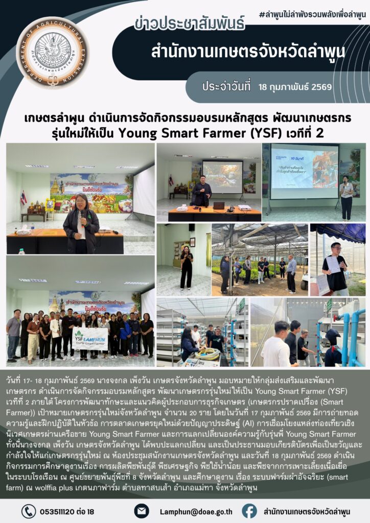 เกษตรลำพูน จัดกิจกรรมอบรมหลักสูตร พัฒนาเกษตรกรรุ่นใหม่ให้เป็น Young Smart Farmer (YSF) เวทีที่ 2By admin_doae / 19 กุมภาพันธ์ 2026