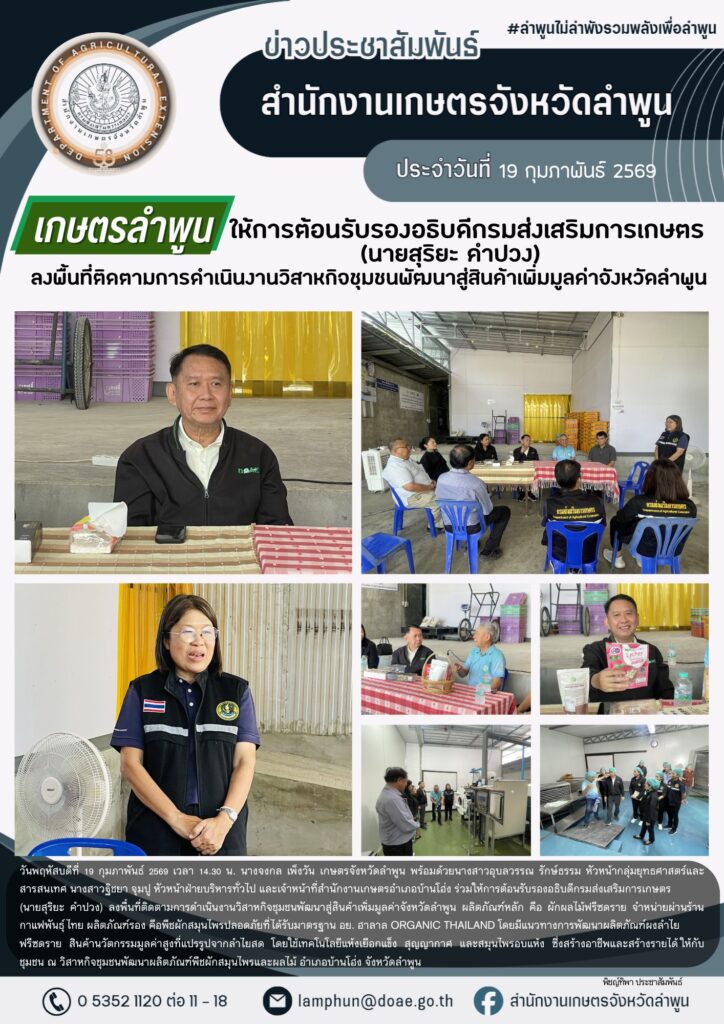 เกษตรจังหวัดลำพูน ให้การต้อนรับรองอธิบดีกรมส่งเสริมการเกษตร (นายสุริยะ คำปวง) ลงพื้นที่ติดตามการดำเนินงานวิสาหกิจชุมชนพัฒนาสู่สินค้าเพิ่มมูลค่าจังหวัดลำพูนBy admin_doae / 20 กุมภาพันธ์ 2026