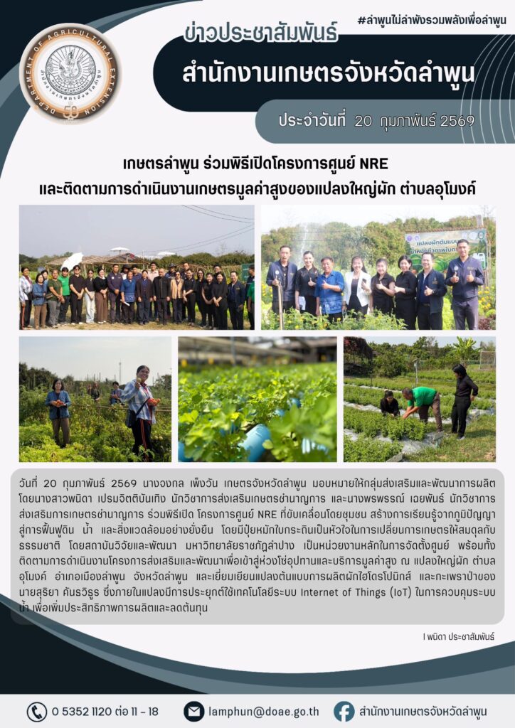 เกษตรลำพูน ร่วมพิธีเปิดโครงการศูนย์ NREและติดตามการดำเนินงานเกษตรมูลค่าสูงของแปลงใหญ่ผัก ตำบลอุโมงค์🥬✨◽️◽️◽️◽️◽️By admin_doae / 23 กุมภาพันธ์ 2026