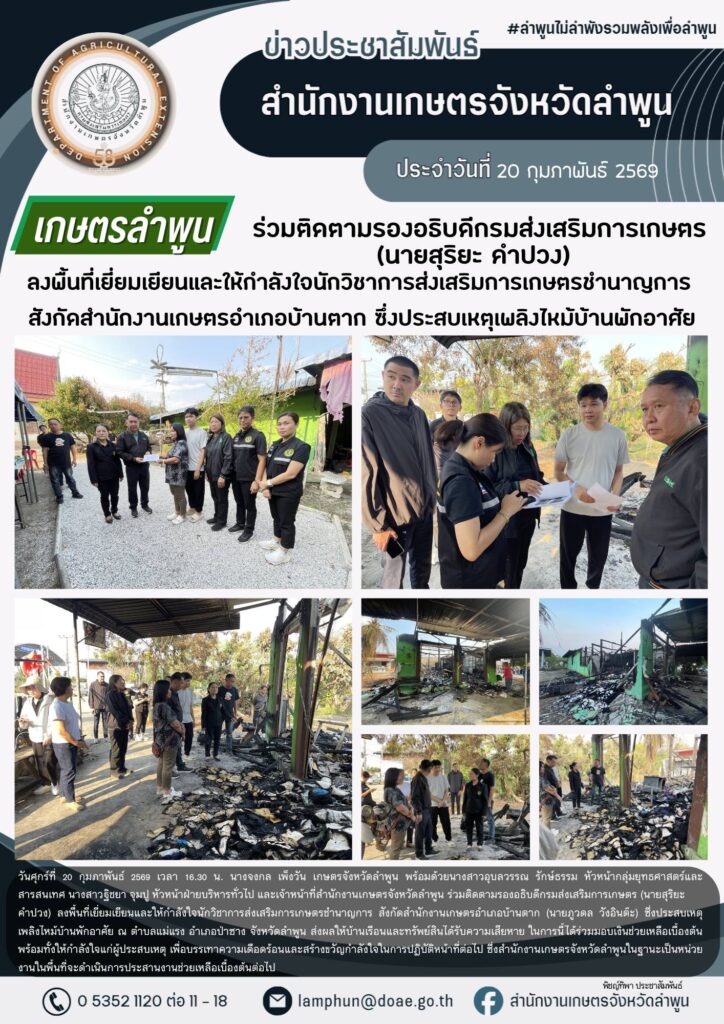 เกษตรลำพูน ร่วมติดตามรองอธิบดีกรมส่งเสริมการเกษตร (นายสุริยะ คำปวง) ลงพื้นที่เยี่ยมเยียนและให้กำลังใจนักวิชาการส่งเสริมการเกษตรชำนาญการ สังกัดสำนักงานเกษตรอำเภอบ้านตาก ซึ่งประสบเหตุเพลิงไหม้บ้านพักอาศัยBy admin_doae / 23 กุมภาพันธ์ 2026