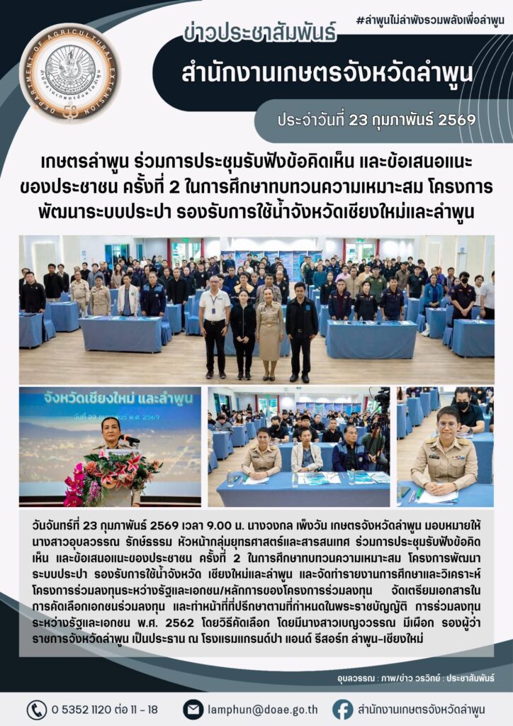 เกษตรลำพูนร่วมการประชุมรับฟังข้อคิดเห็น และข้อเสนอแนะของประชาชน ครั้งที่ 2 ในการศึกษาทบทวนความเหมาะสม โครงการพัฒนาระบบประปา รองรับการใช้น้ำจังหวัด เชียงใหม่และลำพูนBy admin_doae / 24 กุมภาพันธ์ 2026