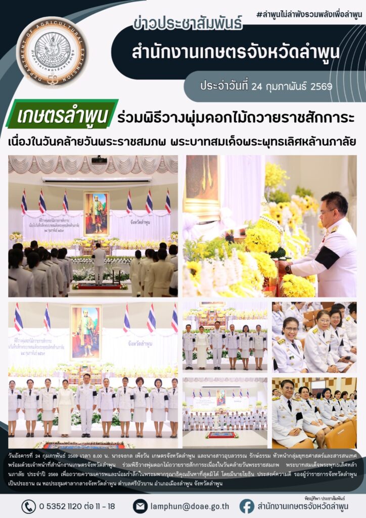 เกษตรลำพูนร่วมพิธีวางพุ่มดอกไม้ถวายราชสักการะเนื่องในวันคล้ายวันพระราชสมภพ พระบาทสมเด็จพระพุทธเลิศหล้านภาลัยBy admin_doae / 25 กุมภาพันธ์ 2026