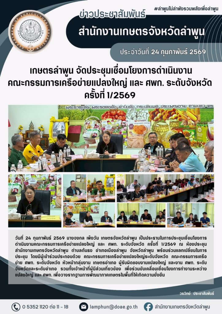 เกษตรลำพูน จัดประชุมเชื่อมโยงการดำเนินงานคณะกรรมการเครือข่ายแปลงใหญ่ และ ศพก. ระดับจังหวัด ครั้งที่ 1/2569By admin_doae / 25 กุมภาพันธ์ 2026